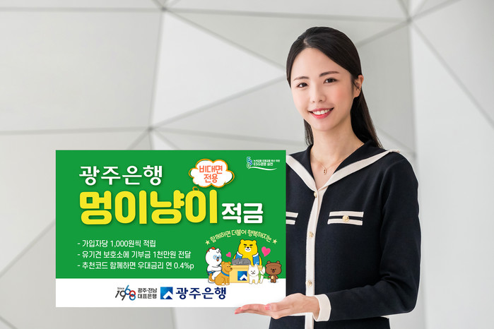 [광주=프레스뉴스] 강래성 기자= 광주은행(은행장 송종욱)은 공익형 ESG 상품인 비대면 전용 ‘멍이냥이 적금’을 출시했다고 밝혔다.