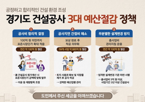 도의 ‘건설공사 3대 예산절감 정책’은 ➀공공 건설공사 표준시장단가 확대 적용, ➁공공 건설공사 지연 간접비 해소, ➂공공 건설사업 총사업비 관리 지침 운용으로, 올해 7월부터 시행 및 운용 예정이다.