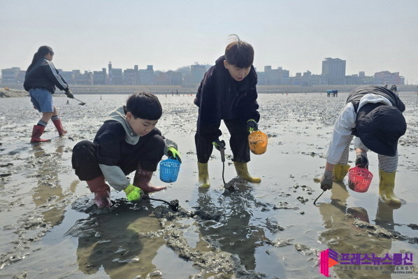 ▲아이들이 갯벌에서 조개 캐기 체험을 하고 있다.(사진=시흥시) |