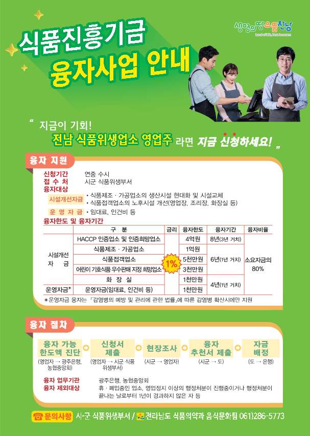 융자를 바라는 영업자는 광주은행이나 농협중앙회 지점에서 대출 가능 여부를 확인한 뒤 시군 식품위생부서에 신청서류를 제출하면 된다. 자세한 내용은 전남도 누리집 공지사항 게시판을 참고하면 된다.
