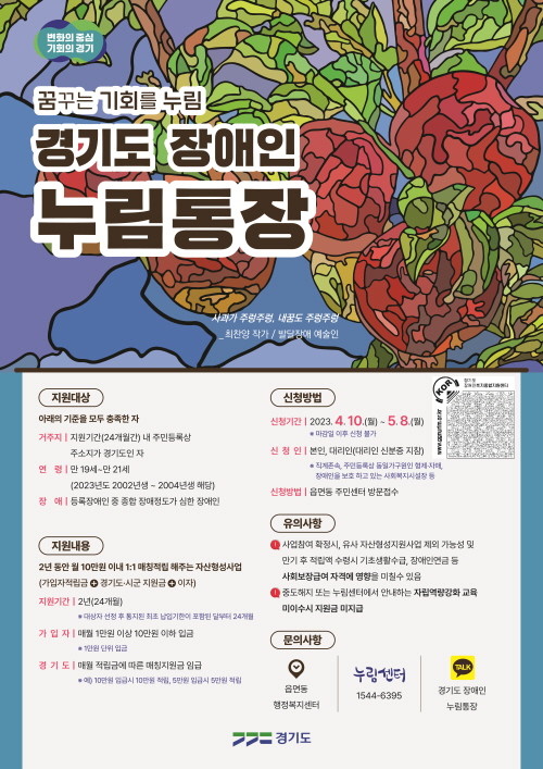 한편 이번 누림통장 홍보 포스터에 삽화를 제공한 발달장애인 미술가인 최찬양 작가는 ‘경기도 누림통장’이 매월 적은 금액이라도 저축을 통해 꿈도 키워가는 기회가 될 수 있다는 의미에서 작품명을 ‘사과가 주렁주렁, 내 꿈도 주렁주렁’으로 정했다고 전했다.