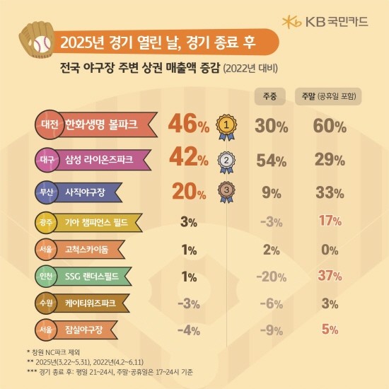 25년 경기 열린 날의 경기 종료 후(평일 21~24시, 주말·공휴일은 17~24시 기준) 야구장주변 상권 매출 증가가 높은 구장은 대전 한화생명 볼파크(46%), 대구 삼성 라이온즈파크(42%), 부산 사직야구장(20%) 순이며 주중, 주말 매출이 동시에 증가했다.