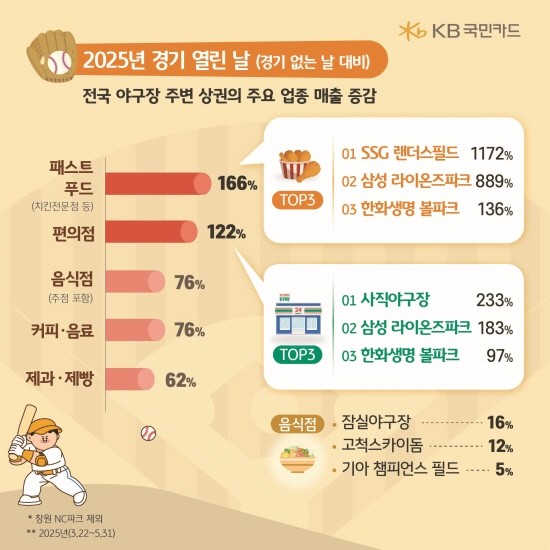[프레스뉴스] 류현주 기자= KB국민카드(사장 김재관)가 2022년부터 2025년까지 야구 경기가 열린 날의 전국 9개 야구장 주변 상권 결제 데이터를 분석했다.
