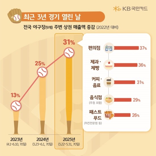 25년 야구 경기가 열린 날 3년 전 대비 매출액 증가가 두드러진 업종은 편의점(37%), 제과·제빵(36%), 커피·음료(31%), 음식점(29%), 패스트푸드(26%) 순으로 나타났다.