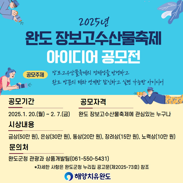 오현철 관광과장은 “공모전을 통해 장보고수산물축제에 대한 관심이 높아지고 축제의 경쟁력을 강화할 수 있는 아이디어가 많이 발굴되길 기대한다”라고 전했다.