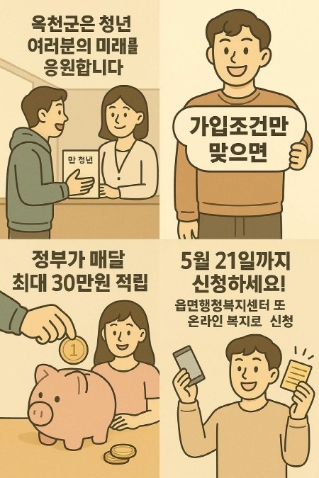 [프레스뉴스] 류현주 기자= 옥천군이 청년의 자립과 미래 자산 형성을 지원하기 위해 '2025년 청년내일저축계좌' 신규 가입자를 오는 21일까지 모집한다.