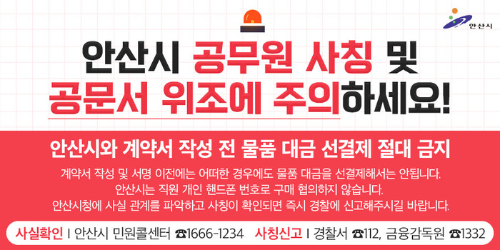 이어 “의심되는 연락을 받을 경우 안산시 민원콜센터(1666-1234)를 통해 관련 부서에 사실 여부를 반드시 확인하고, 의심 사례는 즉시 경찰(112)이나 보이스피싱 신고번호(1394)로 신고해 달라”고 당부했다.