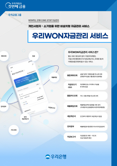 [프레스뉴스] 김대일 기자= 우리은행(은행장 조병규)은 소상공인을 포함한 중소기업의 효율적인 통합 자금관리를 지원하고자 ‘우리WON자금관리 서비스’를 출시했다고 22일 밝혔다.