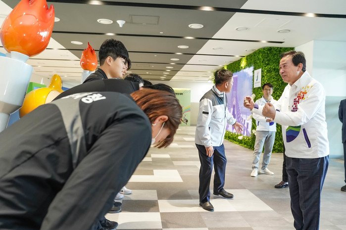 | ▲박홍률 목포시장이 전국체전 참가 선수들을 찾아 격려하고 있다.(사진제공=목포시) |