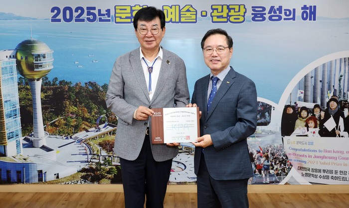 ▲왼쪽부터 김성 군수, 이기헌 한국공공자치연구원 대표이사/장흥군 제공 |