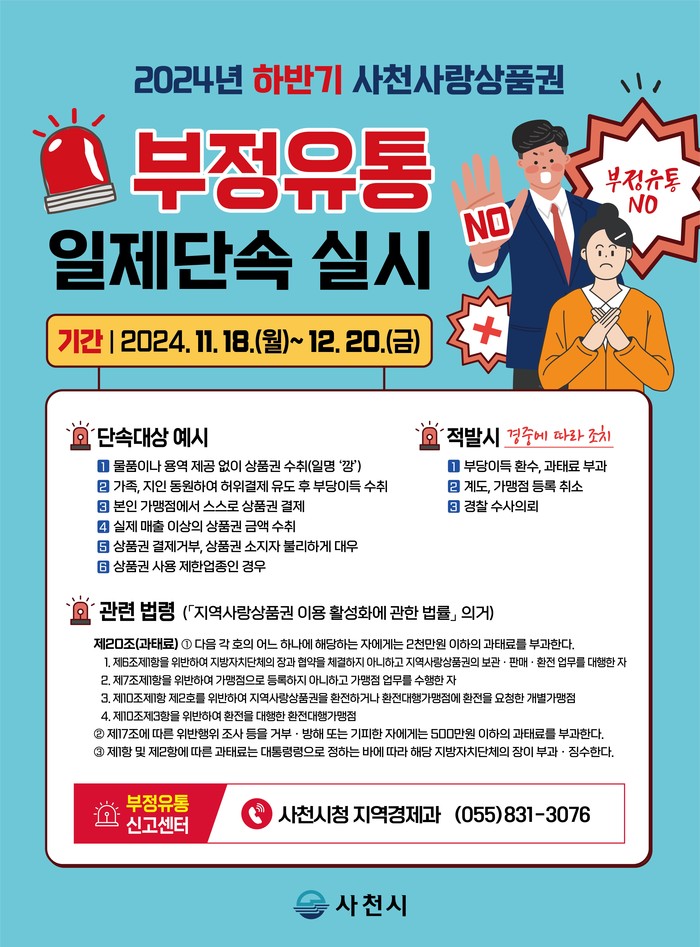 ▲사천시는 사천사랑상품권의 건전한 유통질서 확립을 위해 부정유통 일제단속을 11월 18일 부터 12월 20일까지 실시한다. (사진=사천시) |