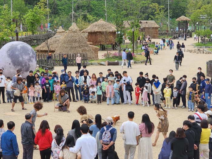 | ▲화순 고인돌 유적지 내 선사체험장에서 버스킹을 즐기고 있다.(사진제공=화순군) |