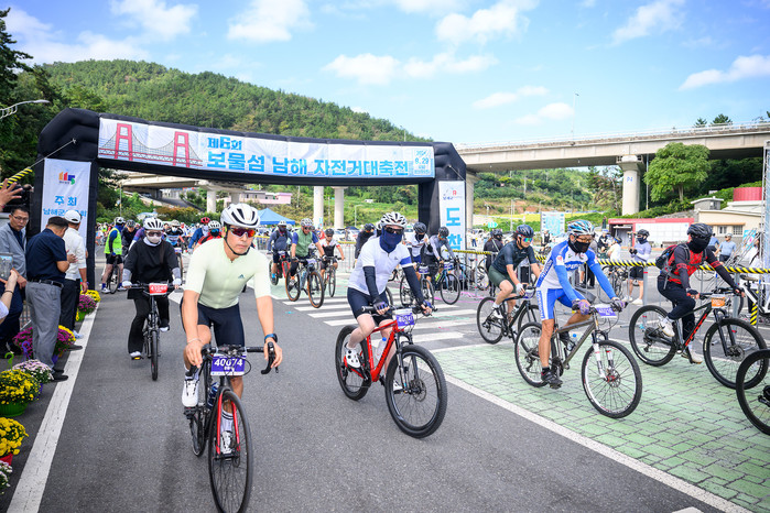 ▲남해군의 그림 같은 해안도로를 배경으로 한 ‘제6회 보물섬남해 자전거대축전’이 9월 29일 남해군 창선단항회센터에서 성황리에 개최되었다 (사진=남해군) |
