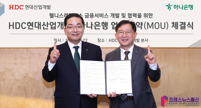 [프레스뉴스] 류현주 기자= 하나은행(은행장 이호성)은 지난 22일 서울 용산구 HDC현대산업개발 본사에서 HDC현대산업개발(대표이사 정경구)과 웰니스 레지던스 사업 활성화 및 입주자 맞춤형 종합자산관리 서비스 제공을 위한 업무협약(MOU)을 체결했다고 밝혔다.