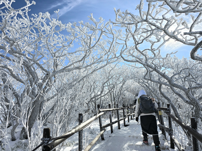 | ▲31일 오후 전북 무주군 덕유산 향적봉 인근에서 등산객이 눈꽃 터널 사이로 지나가고 있다./사진=덕유산국립공원사무소 |