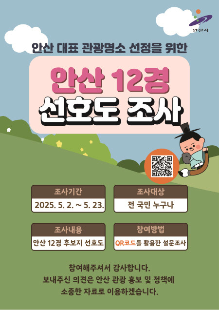 이번 2차 선호도 조사는 ‘안산12경’ 최종 선정을 위한 중요한 자료로 활용된다. 설문 결과는 6월 중 개최될 선정위원회 심의를 거쳐, 6월 말 최종 12경이 확정·발표될 예정이다.