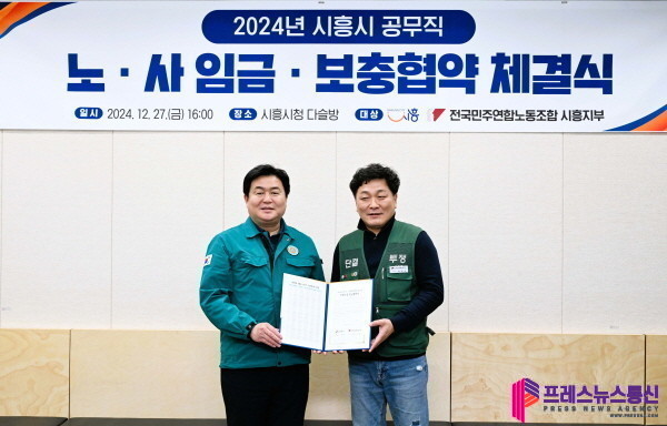 [프레스뉴스] 장현준 기자= 시흥시(시장 임병택)는 지난 27일 시청 다슬방에서 교섭 대표노동조합인 전국민주연합노동조합 시흥지부(지부장 김기범)와 2024년도 공무직 임금ㆍ보충협약을 체결했다.