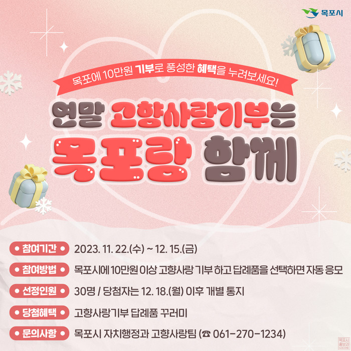 “연말 고향사랑기부는 목포랑”이란 주제로 진행되는 이번 행사는 목포를 선택해 준 기부자들에게 더욱 의미 있는 연말을 선물하기 위해 22일부터 12월 15일까지 진행된다.