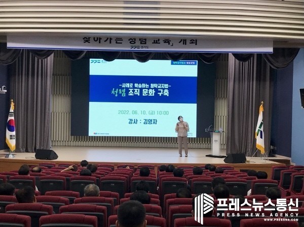 [프레스뉴스] 김대일 기자= 경기도는 10일 오전 경기도청 북부청사 평화누리홀에서 도 하천과 전 직원 및 하천 공사 관계자 등을 대상으로 ‘찾아가는 청렴교육’을 실시했다.