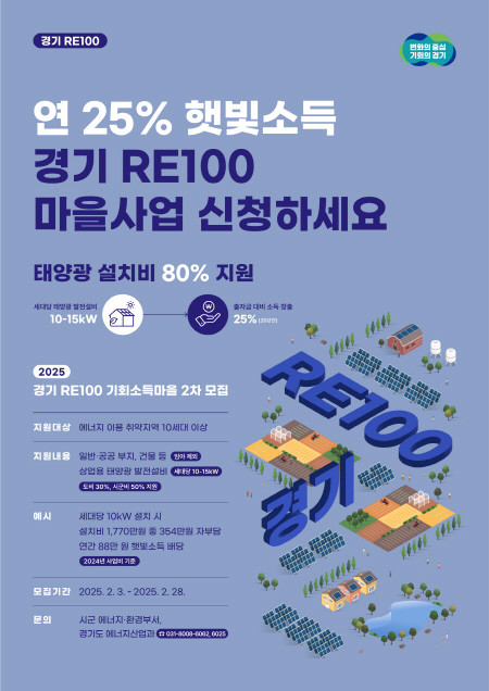 경기 RE100 ‘기회소득 마을’ 사업 참여 신청기간은 2월 28일까지며, ‘경기RE100 누리집 경기RE100이야기 게시판’에서 ‘기회소득 마을’을 검색해 사업계획서와 구비서류를 작성한 후 관할 시군 에너지 담당 부서에 접수하면 된다.