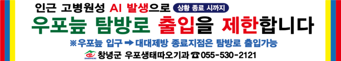 군 관계자는 “이번 조치는 고병원성 조류인플루엔자(AI) 확산을 방지하고, 지역주민과 탐방객의 안전을 최우선으로 고려한 조치다”라며, “우포늪 탐방로 출입제한으로 인한 불편에 대해 양해를 부탁드리며, 조속히 탐방로를 개방할 수 있도록 최선을 다하겠다”라고 말했다.