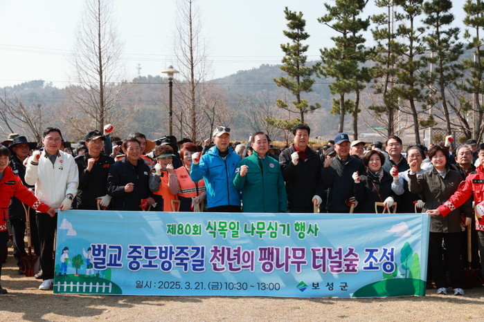 | ▲보성군은 제80회 식목일을 맞아 숲과 나무의 소중함을 알리고, 녹색공간을 확대하기 위해 21일 벌교 중도방죽길에서 나무 심기 행사를 개최했다.(참가자 기념 사진)/보성군 제공 |