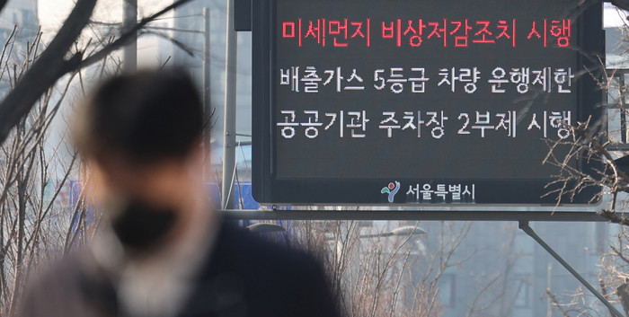 | ▲17일 오전 서울 중구 시청역 앞에 설치된 전광판에 미세먼지 비상저감조치에 따른 공공기관 주차장 2부제 시행 안내문이 표시되고 있다./사진-뉴스1 |