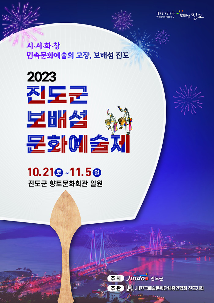 [전남=프레스뉴스] 신상균 기자= 시‧서‧화‧창의 본고장 진도군에서 오는 21일부터 11월 5일까지 2023년 진도군 보배섬문화예술제를 개최한다.