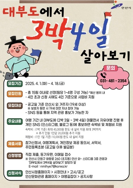 접수 신청은 안산시청 관광과(단원구 화랑로 260)로 직접 방문하거나 등기우편·전자우편으로 가능하다. 자세한 사항은 안산시청 누리집 ‘고시공고’ 란이나 안산문화관광 누리집 ‘여행길잡이-공지사항’에서 확인할 수 있다.