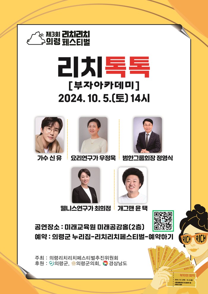 의령군은 올해 리치리치페스티벌 '리치톡톡'에 방송인 윤택, 범한그룹 정영식 회장, 웰니스 연구가 최희정, 요리연구가 우정욱, 가수 신유가 출연해 '진짜 부자' 이야기를 들려준다고 밝혔다. 이들은 부자의 삶·부자의 경제·부자의 건강·부자의 밥상·부자의 노래라는 각각의 주제로 관객들을 만난다.
