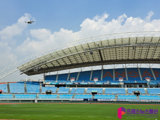 | ▲ 안산시, 드론 활용해 와~스타디움 경기장 안전점검 모습(사진=안산시) |