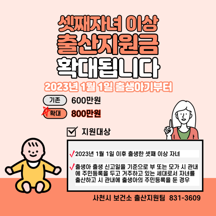 또한 산후조리비는 사천시에 주소를 둔 출산가정에 출산 1회당 현금 50만 원을 지원하며 지원금 확대 방안도 검토 중이다.
