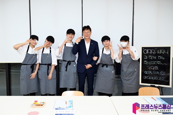 ▲이민근 안산시장(오른쪽 세번째)이 지난 17일 안산국제비즈니스고등학교를 방문해 간담회를 마치고 베이커리카페과 학생들과 기념사진을 촬영하고 있다.(사진=안산시) |