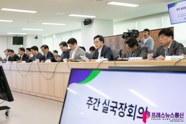 | ▲ 10일 오전 경기도청 다목적회의실에서 김동연 경기도지사, 오병권 행정1부지사, 오후석 행정2부지사, 염태영 경제부지사, 각 실,국장, 경기도 산하기관장 등이 참석한 가운데 주간 실국장회의가 열리고 있다.(사진=경기도) |