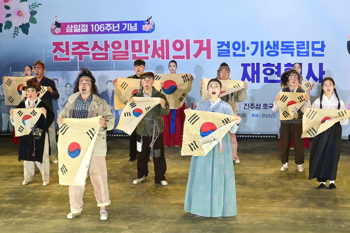 | ▲3.1운동 106주년을 기념하여 지난 14일 진주대첩 역사공원에서 ‘진주걸인·기생독립단 만세운동’ 재현 행사가 열렸다. (사진=진주시) |