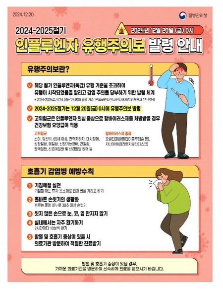 질병관리청은 지난해 12월 전국에 인플루엔자 유행주의보 발령 이후 모든 연령층에서 인플루엔자 환자가 증가하고 있으며, 2025년 첫 주 인플루엔자 의사환자 발생은 1천 명당 99.8명으로 전주 73.9명 대비 35% 증가했다고 밝혔다.