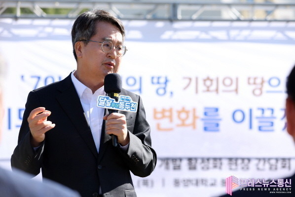 ▲16일 오전 동양대학교 동두천캠퍼스 생동관 잔디 광장에서 열린 경기도 미군 반환공여구역 개발 활성화 현장 간담회에서 김동연 경기도지사가 인사말을 하고있다.(사진=경기도) |