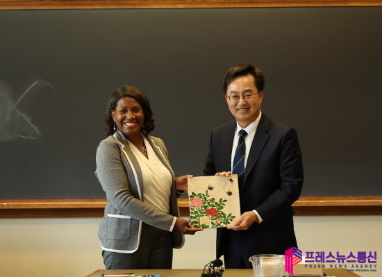 | ▲ 10일 오후 미국을 방문 중인 김동연 경기도지사가 설레스트 왓킨즈 헤이즈(Celeste M. Watkins-Hayes) Ford School 학장과 기념촬영을 하고 있다.(사진=경기도) |
