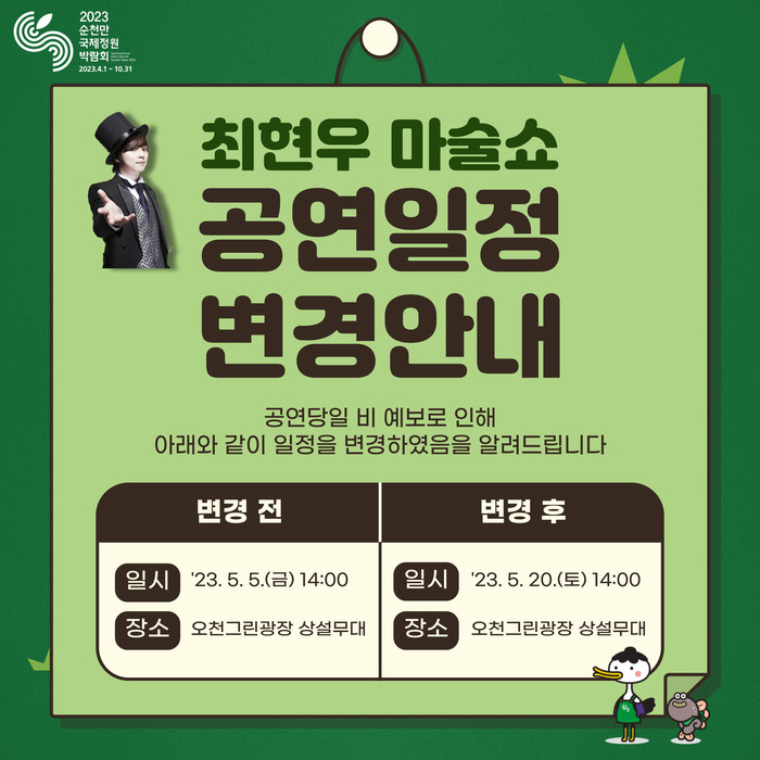 | ▲최현우 마술쇼 일정 연기 안내/순천시 제공 |
