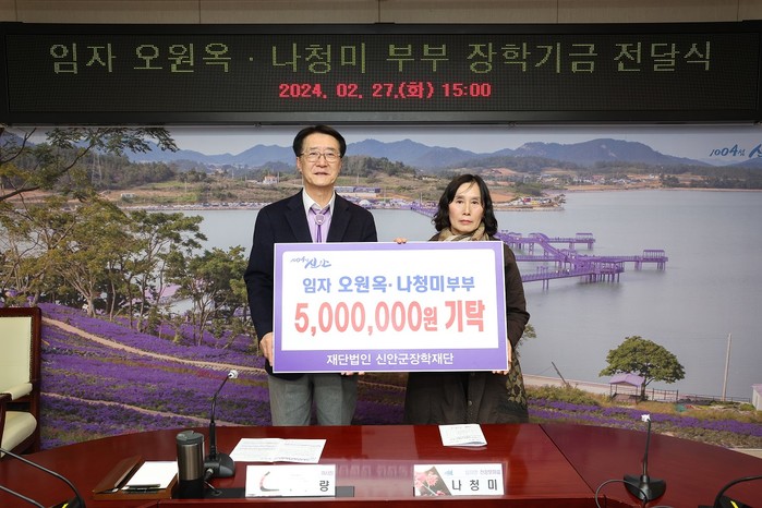 | ▲임자면 오원옥·나청미 부부 장학금 기탁/신안군 제공 |