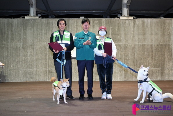 이민근 시장은 순찰에 앞서 한 해 동안 활동 실적이 우수한 반려견 순찰대 2팀에게 표창장을 수여했으며, 활동 실적이 우수한 반려견 아큼(진돗개, 3살)과 밤이(시바견, 6살)를 ‘안산시 명예공무원’으로 임명했다.