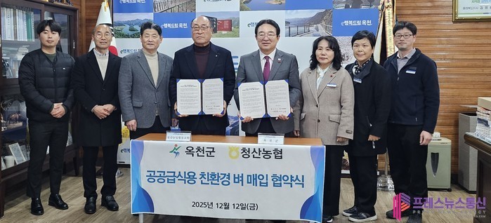 [프레스뉴스] 류현주 기자= 옥천군은 지난 12일 청산농업협동조합과 함께 지역에서 생산된 친환경 벼 매입 및 공공급식 친환경 쌀 공급을 위한 협약을 체결했다. 이번 협약은 지역 생산 농산물이 지역 내에서 소비되는 선순환 체계를 구축하고, 친환경 농업의 지속가능성을 높이기 위한 취지에서 마련됐다.