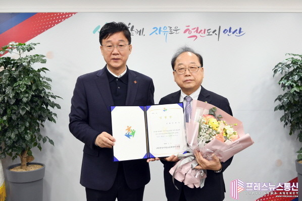 | ▲ 안산시, 전희일 안산시청소년재단 3대 대표이사 임명(왼쪽부터 이민근 시장, 전희일 대표이사)사진=안산시 |
