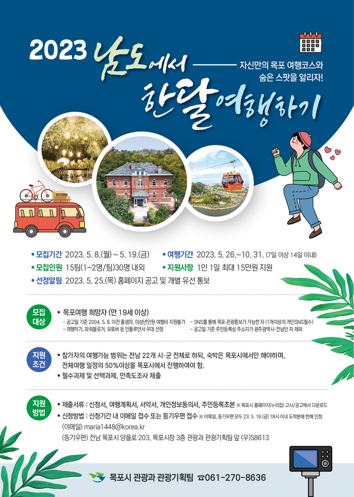 [전남=프레스뉴스] 이광남 기자= 전남 목포시가 장기여행하며 목포의 아름다움을 체험하고, 자신만의 여행코스와 숨은 관광자원을 홍보할 ‘한 달 여행하기’ 참가자를 오는 19일까지 모집한다.