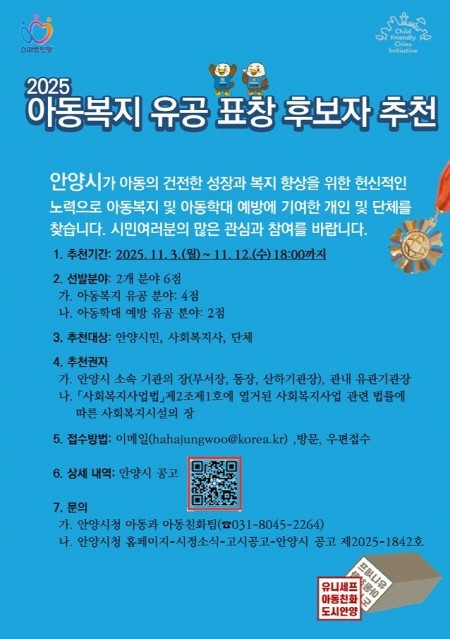 최대호 안양시장은 “아동복지에 헌신하신 분들의 귀감이 널리 알려질 수 있도록 많은 시민께서 후보자 추천에 관심을 갖고 주시길 바란다”고 말했다.