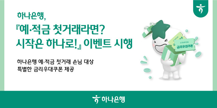 [프레스뉴스] 류현주 기자= 하나은행(은행장 이호성)은 예금 또는 적금 상품에 처음 가입하는 손님을 대상으로 금리우대쿠폰을 제공하는 『예·적금 첫거래라면? 시작은 하나로!』 이벤트를 실시한다고 밝혔다.