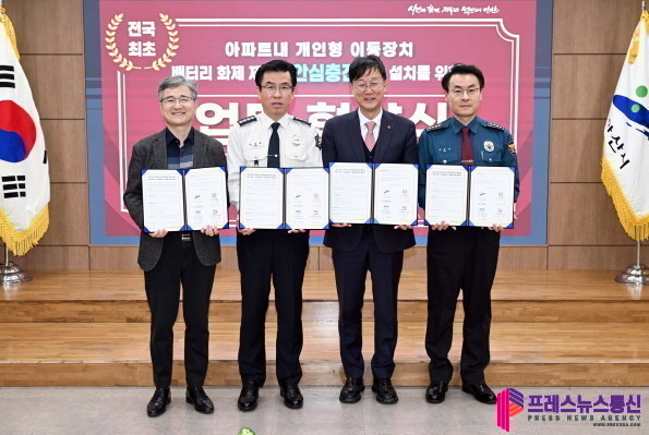 [프레스뉴스] 장현준 기자= 안산시(시장 이민근)는 지난 10일 안산시청 제1회의실에서 안산소방서 등 4개 기관과 아파트단지 내 개인형 이동장치(PM : Personal Mobility) 배터리 ‘안심 충전소’ 설치를 위한 업무협약(MOU)을 체결했다고 11일 밝혔다.