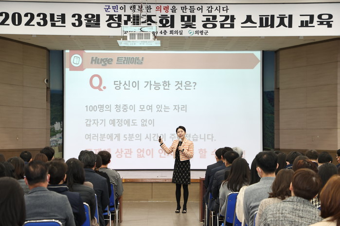 [프레스뉴스] 정재훈 기자= 의령군은 조직 내·외부와의 소통 능력 향상을 위해 지난 2일 군청 대회의실에서 오태완 군수를 비롯해 전 직원을 대상으로 공감 스피치 교육을 진행했다.