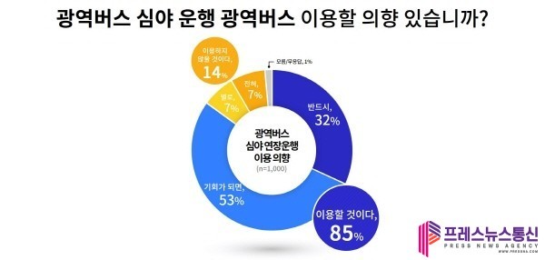 응답자 85%는 야근이나 개인 일정 등으로 자정 이후 귀가할 때 심야 시간 운행되는 광역버스가 있다면 해당 노선의 광역버스를 ‘이용할 것’이라는 의향을 밝혔다.