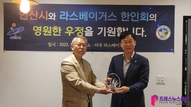 [프레스뉴스] 장현준 기자= 안산시(시장 이민근)는 지난 6일(현지시간) 자매도시인 네바다주 라스베이거스시와의 우호관계 발전에 기여한 공로를 인정해 김동준 라스베이거스한인회장에게 공로패를 수여했다고 8일 밝혔다.